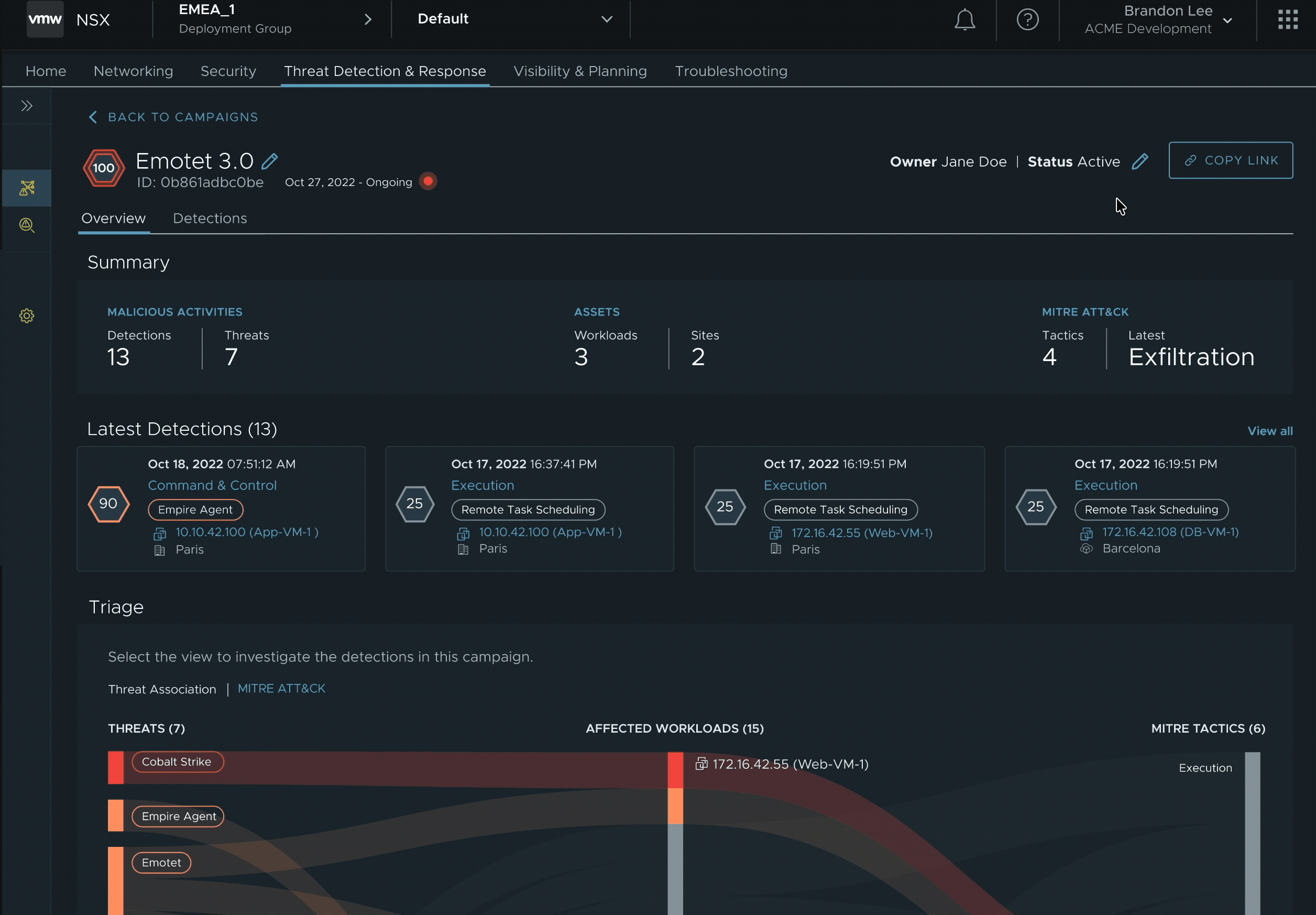 After rounds of discussions with the backend and frontend teams, I understood the ins and outs of detection and campaigns. We set out to consolidate essential information into a single surface — making the relationship among threats, workloads, and attack stages immediately visible.
