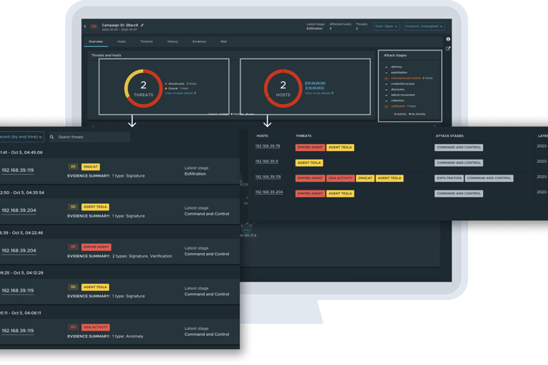 The existing NDR Defender experience relied on dashboard cards that led to separate pages for Threats, Hosts, and Detection details. Each view contained valuable data, but analysts had to navigate between them to reconstruct an attack chain manually.